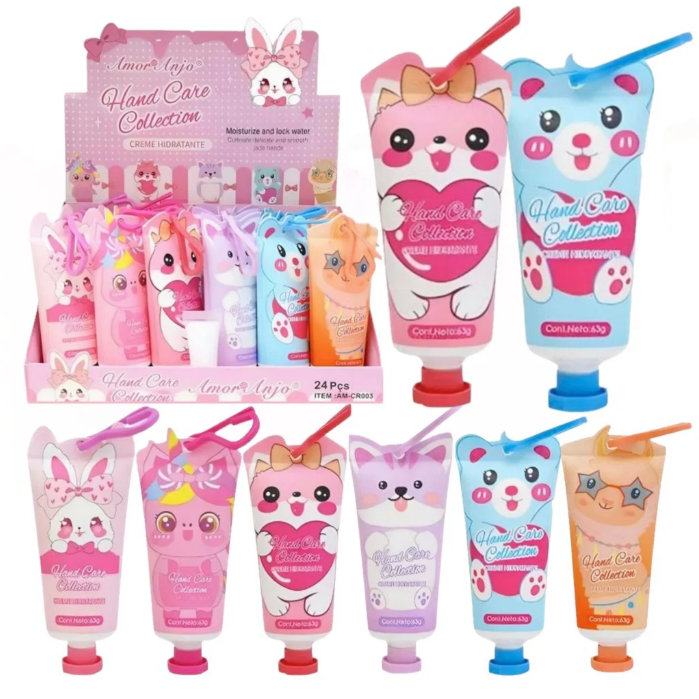 O Creme Hidratante para Mãos da Amor Anjo é perfeito para quem ama praticidade, cuidado e muita fofura no dia a dia. Com textura leve e rápida absorção, ele deixa as mãos macias, hidratadas e perfumadas sem ficar pegajoso. São seis modelos de embalagens, cada uma representando um animal superfofo todos pelo mesmo preço. Cada hidratante ainda acompanha um chaveiro , ideal para pendurar na bolsa ou mochila, tornando o uso ainda mais prático. Um produto delicado, funcional e encantador, perfeito para presentear ou levar sempre com você.